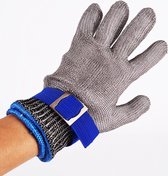 De oesterhandschoen maat M is vervaardigd uit roestvrij staal met een blauwe kunststof band die met een gesp strak om de pols getrokken kan worden. De...
